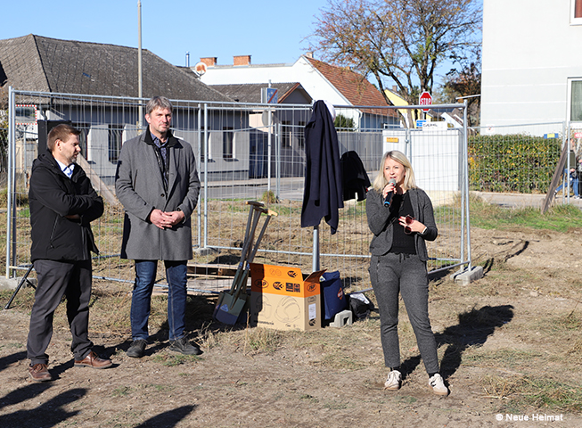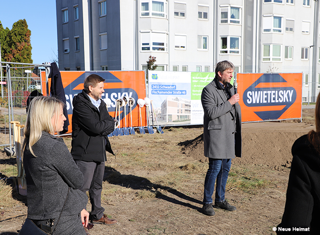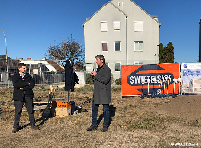 The groundbreaking ceremony was officially celebrated by the builder of ‘Neue Heimat Gemeinnützige Wohnungs- und Siedlungsges. Ges.m.b.H, Mr Christian Wieseneder; the mayor of Schwadorf, Jürgen Maschl; and Member of the National Council, Ms Silvia Kumpan-Takács MSc BA. During their presentations, they all emphasised the importance of the project for the community and future residents.