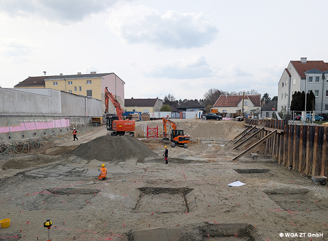 Der Aushub bis zu den erforderlichen Sohlenhöhen ist im ersten Bauabschnitt erfolgt. Die Absteckung der Fundamentbereiche erfolgt mittels Vermessung und wird durch Markierungen im Gelände kenntlich gemacht. Die Einhaltung der Sollhöhen wird während des Aushubs laufend kontrolliert. Im nächsten Schritt erfolgt der Einbau einer Rollierung als kapillarbrechende Schicht sowie einer Trennlage. Anschließend werden die Sauberkeitsschichten hergestellt und die Bewehrungsarbeiten für die nachfolgenden Betonierarbeiten ausgeführt.