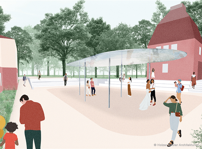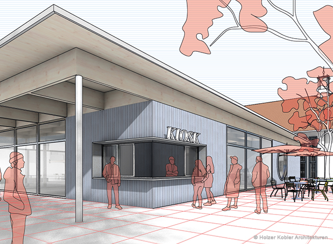 Der Veranstaltungssaal bietet eine Kapazität für bis zu 300 Personen und ist somit ideal für große Events. Der Zugang zum Hauptgebäude erfolgt flexibel über drei Eingänge. Von der Erweiterung – bestehend aus Gastronomie, Kulturterrasse sowie dem Kiosk – gibt es eine direkte Verbindung zum Veranstaltungssaal um einen reibungslosen Ablauf bei Veranstaltungen zu gewährleisten.