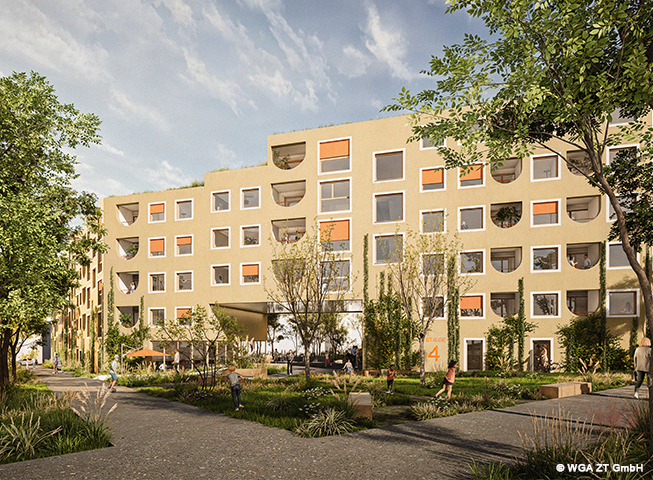 Balkone und geschützte Loggien bieten den Bewohner:innen Raum für persönliche Rückzugsmöglichkeiten und die Gestaltung grüner Oasen, die den Wohnkomfort steigern. Auch der Gemeinschaftsraum wird durch den geschützten Innenhof erweitert, der den Nutzer:innen als exklusiver Freiraum zur Verfügung steht. Fahrradabstellräume, Kinderwagenabstellplätze und einen Waschsalon im Erdgeschoss runden das wohnbezogene Angebot der neuen Wohnanlage ab.