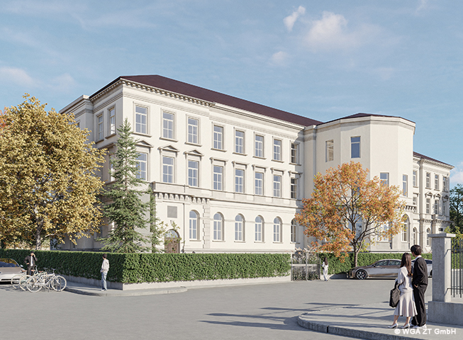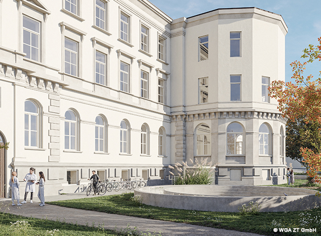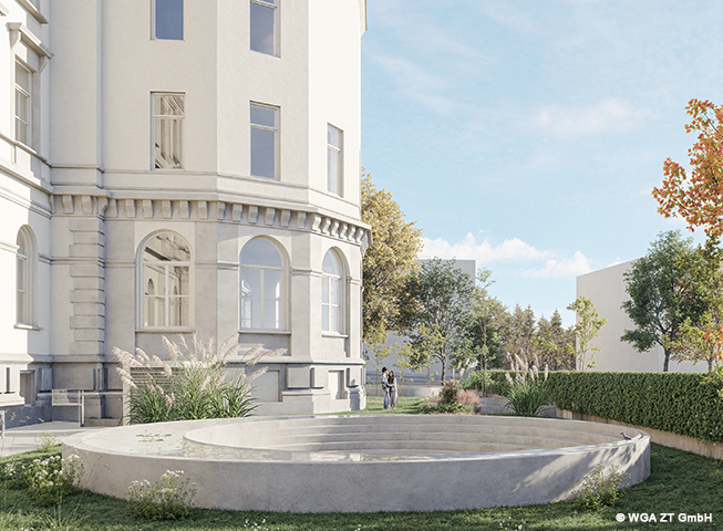 sich auch im Außenraum fort. Bodenbeläge und Sitzelemente in Sichtbetonoptik greifen das klare, moderne Erscheinungsbild auf und bilden zugleich einen bewussten Kontrast zum Erscheinungsbild des Bestandsgebäudes. Ergänzt wird die Gestaltung durch Wasserelemente und neu angelegte Rasenflächen, die eine hohe Aufenthaltsqualität für Studierende und Mitarbeiter:innen bieten.