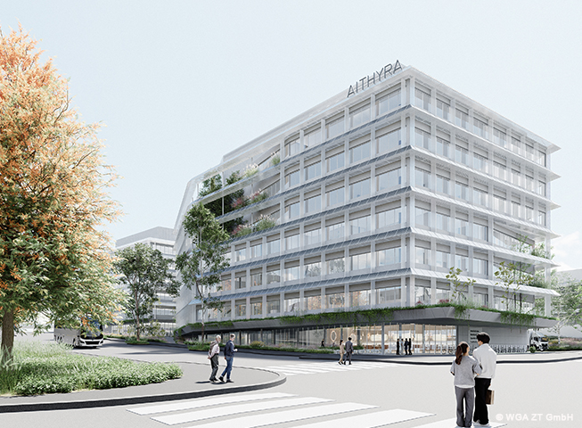 Das Laborgebäude wird durch einen begrünten Sockel charakterisiert, der sich einladend in Richtung des Hauptzugangs im Nordosten öffnet. Die leicht ansteigende Topografie entlang der Litfaßstraße wird integriert und leitet in den angrenzenden Grünraum über, der zukünftiges Entwicklungspotenzial bietet.